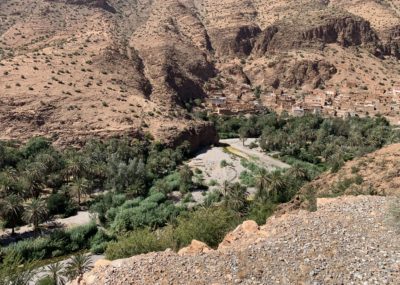 A l’embranchement du goudron qui part vers Tiout à droite, continuer tout droit sur environ 3 km, prendre sur la gauche et poursuivre sur 15 km environ, la route longe un oued que l’on franchit plusieurs fois puis commence à monter dans l’Anti-Atlas. S’arrêter à Ilmagen pour voir un Agadir avec une belle tour de défense, l’Agadir est ruiné mais la tour de défense est assez remarquable. Ensuite continuer encore cette route qui monte jusqu’à Imintezgui, petit village typique de l’Anti-Atlas avec la palmeraie au fonds de l’oued. Stationner la voiture le long de la route et pour les courageux, descendre visiter la palmeraie par le sentier d’âne qui descend au fonds de l’oued. Si l’on poursuit cette route, on peut arriver jusqu’à l’Agadir N’Tazrout , véritable nid d’aigle (voir article sur les Agadirs) au-dessus du village de Tafgit